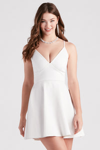 You'll be dressed to impress in this ponte skater dress as a graduate or bride-to-be! It features a sleeveless V-neckline, spaghetti straps, a flattering fit and flare silhouette, and a short-length hem. Complete the look in chic rhinestone heels.
