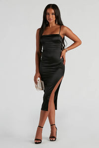 Arrive fashionable late to capture all the attention strolling in this sultry cowl neck midi dress! It features a sleek and sleeveless bodice with adjustable spaghetti straps, a form-hugging silhouette, and a front side ruched seam atop the slit hem. Complete the look in this midi-length dress with stiletto mules.
