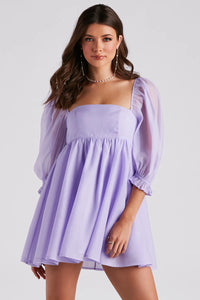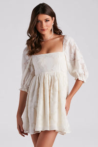 You'll be a darling delight in this short skater dress perfect for parties and ceremonies! It features three-quarter-length puff sleeves, a square neck, a smocked back, and a fit and flare silhouette. The dress is composed of a floral burnout woven fabric with a chiffon lining and no stretch. Style with earrings and a choker to complete the look!