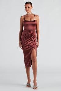 Showcase a sleek sheen in this gorgeous satin midi dress! The knee-length dress features a sleeveless cowl square neckline with pleating, adjustable spaghetti straps for a customized fit, and ruched detailing. A sparkly rhinestone trim cascades from the side to the front leading to a midi-length, asymmetrical hem creating a chic side slit to show off your legs. Style this curve-hugging dress with metallic heels for your next fancy date night.