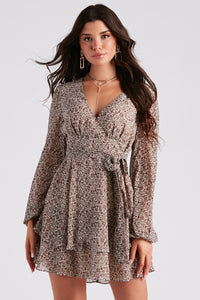 Transition your winter blues into fresh spring florals! This breezy chiffon skater dress is perfect for dressy brunches or engagement parties. It features a surplice V-neckline, sheer peasant sleeves, a tie-back belted waist, and a tiered ruffle short-length hem with an adorable ditsy floral print. Complete the look in lace-up heels.