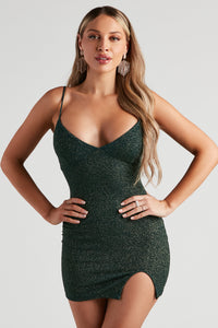 Tonight is all about you in this glitter knit mini dress! Create a flawless glow in this sleeveless V-neck dress with sleek spaghetti straps, a bodycon silhouette, and a front slit accent along the hem. The glitter knit fabric offers a moderate stretch. Complete the look with a glitzy clutch purse.