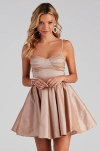 Miake it a fab night out with a formal skater dress that brings the style to your event! The dress features a sleeveless sweetheart neckline with padded cups, adjustable spaghetti straps that cross at the back, and lace-up straps. Her slim-fit bodice leads to a flared skater skirt with hidden side pockets. The dress is composed of a lined taffeta fabric that offers a form hugging fit with a moderate stretch. Complete look with rhinestone heels and a clutch.