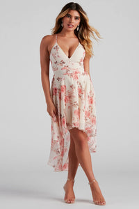 Got yourself a new love? This floral hi-low dress is sure to make them swoon! It features a sleeveless, v-neck, spaghetti straps, open lace-back accent with zipper closure, composed of airy chiffon-lined fabric with no stretch. Complete the look in sparkly heels.