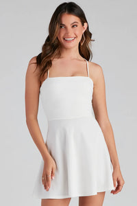 Pretty and poised, this crepe skater dress is perfect for a dressy occasion! Featuring a sleeveless, square neck, spaghetti straps that cross in the back with lace detail, and a short-length hem. Complete the look in strappy heels and earrings.