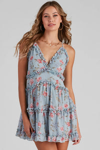 It may start out as flirty but this floral babydoll dress is in for the long haul. It features a sleeveless, ruffle-trim V-neckline, adjustable spaghetti straps, open-back with cross straps, and a fitted bodice atop a tiered, flowy mini skirt. This dress is composed of airy chiffon fabric with an inner lining. Complete the look in chic sandals.