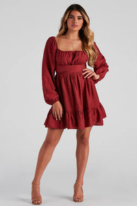 You'll look effortlessly stylish this season in this lightweight and flowy linen dress! Designed with a breezy woven fabric, this short dress is perfect for your summer parties. The bodice is shaped with a square neckline with ruching at the bust and long balloon sleeves. The fitted waistband creates a cinched silhouette, flowing out to a short ruffled hem with an A-line fit for a pretty flair. Complete the look with clear heels.
