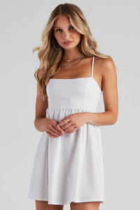 This simple and sleek satin mini dress has major chic vibes! It features a sleeveless square neckline, adjustable spaghetti straps for a customized fit, a back zipper closure, and a short, A-line silhouette. Style this flirty dress with a pair of strappy stilettos.