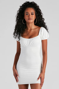 This puff sleeve mini dress is the perfect sunny day sweet treat! It features a scoop neck, empire waist seam, bodycon silhouette, and a mini-length hem on jersey knit-lined fabric with a moderate stretch. Complete the look with a chic crossbody bag for a day out.