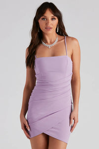 Short, sweet, and extra flirty this mini dress is just what you need for every occasion! It features a sleeveless, square neck, spaghetti straps, princess seams on the bodice, and a faux wrap asymmetrical skirt with side pleating. Complete the look in platform heels.
