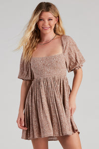 You'll be a total cutie in this floral skater dress perfect for shopping at the farmer's market! It features 3/4 length puff sleeves, a square neck, high-waist seam, and a flowy short-length hem. Complete the look with a crossbody bag.