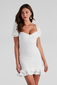 Your summer is looking blissful with this adorable eyelet mini dress perf for celebrations! It features a puff sleeve, sweetheart neck with a ruched bust seam, bodycon silhouette, and a ruffled tier mini-length hem. Complete your dressy look in chic rhinestone heels.