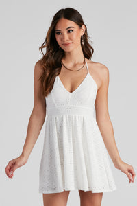 Sweet and flirty, this eyelet knit skater dress is a must for weekend brunch! It features a sleeveless V-neckline with halter spaghetti straps, an open-back design, and a short skater skirt with a fit and flare silhouette. The lightweight knit fabric features an all-over floral eyelet pattern. Complete your look with a denim jacket and sandals.