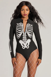 Show up and stun as a glam ghoul this Halloween in this skeleton print bodysuit! It features a mock neck with a zip-front design to create a plunging neckline, long fitted sleeves, and a cheeky form-hugging fit. Complete your costume with sultry fishnet tights.