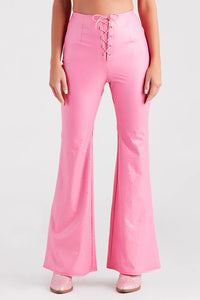Live your best dream life as an iconic fashion doll this Halloween! These sleek faux leather flare pants feature a high-rise waist, a lattice front design with a tie closure, a hidden side zipper closure, a hip-hugging fit, a form-hugging fit throughout the leg, and a flared hem. The lined faux leather fabric features mini rhinestone embellishments down the front of the leg for that stylish and stunning sparkle. Complete your fab costume with the matching corset top and rhinestone boots!