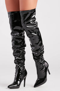 These patent leather stiletto boots meet your high fashion standards! Whether you're dressing up for a party or out with the girls, these boots are perfect. They feature a sleek pointed toe, inner zipper closure, and a sexy thigh-high shaft height. Complete the look with a sultry mini-dress.