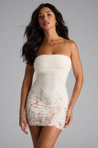 The gorgeous Felicia mini dress is sure to be complemented all night! Crafted with endless delicate beads, this floral dress boasts a flattering strapless cowl neckline and bodycon fit.