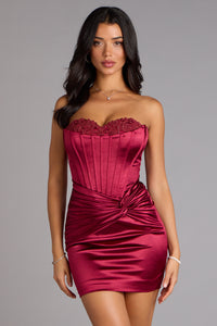 Effortlessly glamorous, the Alexia satin mini dress features a strapless corset bodice with delicate lace and beaded trim at the bust and a sculpted fit that moves with you. The lace-up back and knotted accent create a perfect mix of structure and romance.