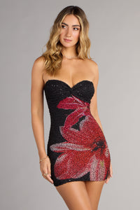 Alora Sequin Beaded Floral Mini Dress Alora Sequin Beaded Floral Mini DressSpecial Occasion Made to mesmerize the moment you walk in, the Alora strapless mini dress shimmers with intricate sequin beading and a dramatic floral design. Sleek and sculpted, it’s the perfect piece for stepping into the night with confidence and allure. Fit & Features - Sheer mesh fabric with knit lining, high stretch