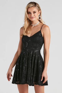 Sweet and flirty, this adorable skater dress is perfect for Homecoming season! It features a sleeveless V-neckline, adjustable spaghetti straps for a customized fit, a high waist seam, and a short skater skirt with a fit and flare silhouette. The lined lace fabric features all-over sequin embroidery for the prettiest shine. Complete the look with platform heels.