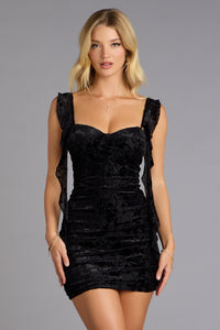 Romantic with an edge, the Juliette velvet mini dress features a corset-inspired bodice and flirty ruffle straps. Designed with a bodycon fit and ruched detailing, it’s the perfect blend of sultry and sweet for your next dressy night out.