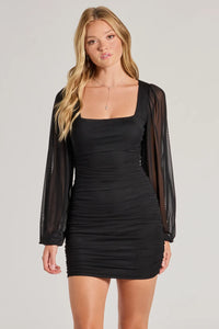 A mesh mini dress features sheer fitted long sleeves, a center ruched design to accentuate your curves, and a bodycon fit. Perfect for the school dance or a party.