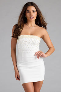Chic Glamour Pearl Trim Mini Dress Chic Glamour Pearl Trim Mini DressThis curve-flaunting mini dress will showcase chic glamour at graduations, dressy dinners, and parties! The strapless bodice features faux pearl embellishments for a luxe touch. Fit & Features - Crepe fabric, stretchy knit lining, moderate stretch