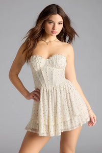 Found Love Corset Rhinestone Lace Skater Dress Found Love Corset Rhinestone Lace Skater DressCelebrate your romantic era in this strapless skater dress designed with a corset bodice that snatches your figure and rhinestone embellishments for a glam allure! Fit & Features - Lace-lined fabric, rhinestone embellishments