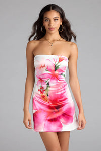 Ocean View Tropical Floral Satin Mini Dress Ocean View Tropical Floral Satin Mini DressEnjoy a dinner with an ocean view in this tropical floral satin mini dress! With a flattering strapless neckline and flowy A-line silhouette, this dress will have you feeling vibrant and luxe. Fit & Features - Tropical floral print, satin fabric, stretchy knit lining