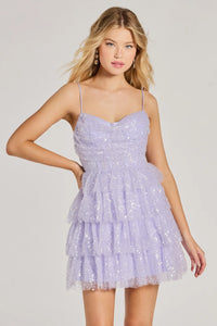 This party dress makes an entrance featuring a flattering cowl neckline, adjustable spaghetti straps, and a corset bodice with padded bra cups and flexible boning. Twirl all night in the tiered ruffled short silhouette embellished with glitter sequins tulle material that sparkles.