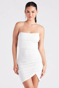 Step out looking decadent in this crepe mini dress as the chic bride-to-be or cocktail party guest! It features a sleeveless square neck, spaghetti straps that lace up along the back, a center front ruched seam, and a bodycon silhouette. The dress is designed with all-over faux pearl embellishments on stretchy crepe fabric. Complete the look in sleek stiletto heels.