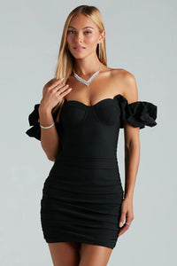 Don't be surprised by all the raised glasses when you stroll into the party in this adorable off-the-shoulder mini dress! It features a sweetheart neckline with non-slip grip lining, trendy puff short-sleeve cuffs, a padded and underwire bust, and ruched seams down the sides and back that flatter your curves along the bodycon silhouette. The dress is composed of a mesh fabric with a sewn-in knit lining. Complete the look with statement hoop earrings and heels.