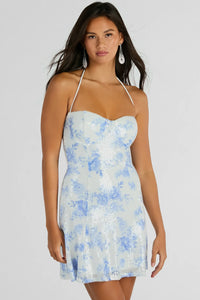 Get enchanted by the sparkly excellence of this floral sequin dress designed to shimmer at showers and celebrations! The sweetheart halter neckline with tie closure and A-line silhouette flatter any figure, while the mini-length hem and floral print on sequin embellished fabric make it perfect for any occasion. Complete the look in strappy-heeled sandals.