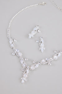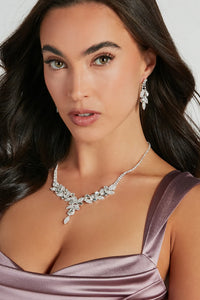 This luxe and elegant jewelry set features a sparkly rhinestone necklace accented with a hanging teardrop rhinestone with a mini rhinestone halo for all the more shine. The short drop earrings feature a matching teardrop rhinestone design, a perfect look for your next glam affair.