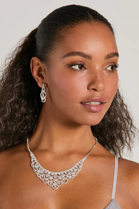 The glam sparkle of this rhinestone statement necklace and earrings set will level up the luxe factor of your formal outfit! It features a collar necklace with a single strand of rhinestones leading to two rows of rhinestones and an exquisite center design of mini rhinestones in chic leaf shapes and larger teardrop rhinestones. The duster earrings feature a matching rhinestone design for a seamless look. Style this set with an envelope clutch.