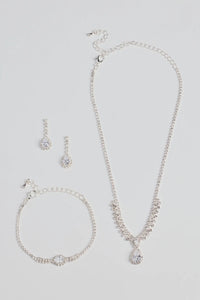 Treat your exclusive look to this decadent rhinestone jewelry set! Adorned with sparkling teardrop rhinestones, this set includes one pair of earrings, one bracelet, and one necklace for a stunning and coordinated look. Elevate any outfit and exude radiance with this elegant set. Complete the look with heels.