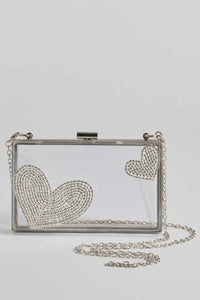 All eyes will fall on you carrying this clear box bag! Dazzling rhinestone hearts adorn the exterior while a detachable chain shoulder strap allows for versatile styling. The top clasp closure opens to a spacious interior for your essentials. Complete the look with a sparkling bracelet for a concert or evening out!