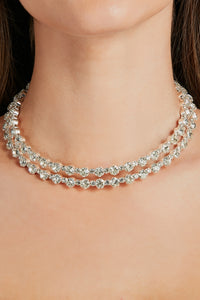 Show off this rhinestone choker all over town! With its chunky design and a double row of sparkling rhinestones, this choker adds a touch of luxury to any outfit. Finished with a back adjustable chain with a lobster clasp closure to secure the style. Complete the look with statement stud earrings for a formal occasion!