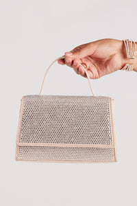 This gorgeous iridescent rhinestone handbag has all the glitz and glamour you'll love! It features a small top handle design with a fold-over closure, mini iridescent rhinestone embellishments, and a metallic trim. Includes an attachable chain-link shoulder strap. Style with a satin skater dress and platform heels.