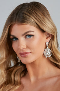 Girl, you'll look so fine in these radiant statement earrings! They feature a round post with mini rhinestone embellishment connected to an embellished circular outline with teardrop-shaped rhinestones. Pair these earrings with a glitzy clutch.
