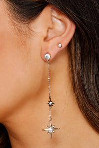 Radiant and oh-so-glam, this earrings set will add a stylish sparkle to your look. It features duster earrings with a linear design with a round rhinestone stud connected to a dainty chain. The chain showcases two star charms with center rhinestone embellishment. The set also features a pair of small rhinestone stud earrings. Style this set with a trendy statement cuff.