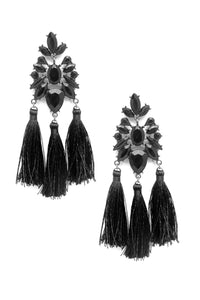 Take a step into your chic side with these tassel earrings! They feature a cluster of large faceted gems, and three hanging tassels. Earrings have a post back closure.