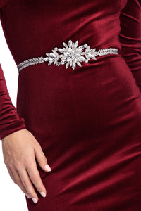Your beauty will blossom and shine with this shimmering statement belt! The stunner features two rows of rhinestones in pretty leaf shapes leading to an elegant floral centerpiece design made of faceted gemstones. The silver belt includes an adjustable lobster clasp closure.
