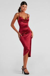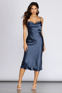 Enchant them all with the captivating Lillyanne formal midi dress! She features a sleeveless bodice, a trendy cowl neckline, adjustable spaghetti straps for a customized fit, and a strappy cross-back design. Her high waist seam elongates your silhouette and leads to a mid-length skirt with an asymmetrical wrap hem creating a front slit. The midi dress is composed of a satin fabric that offers a curve-hugging fit with a moderate stretch. Complete the look with clear heels and a sleek satin clutch.