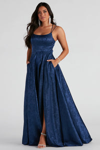 You'll be ready to celebrate the night in the Abby formal ball gown designed to capture all the attention! She features a sleeveless boat neckline, dual adjustable spaghetti straps, and an open back with an alluring lace-up design for a customized fit. Her high waist seam effortlessly leads to the A-line silhouette with a sultry front slit to showcase some leg. The formal dress is composed of a floral jacquard woven fabric with an inner lining and no stretch. Complete your event look in this long dress with a stunning hairpiece and clutch.