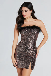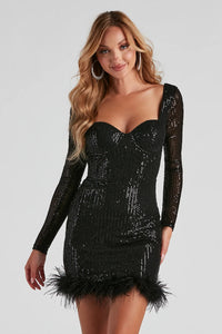 Bring the shine tonight in this sequin mini dress ready for a good time! The mesh mini-length dress features a strapless neckline with a fab marabou trim, bodycon silhouette, and front slit accent. Complete the look with earrings for a dressy celebration party!