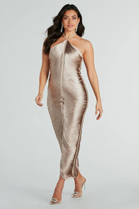 Chrome Chic Metallic Ruched Halter Mini Dress