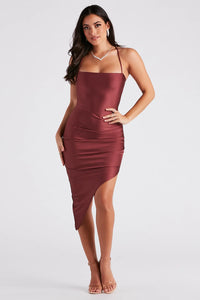 Look and feel like pure perfection in this classy satin midi dress for cocktail hour and semi-formal occasions! It features a sleek sleeveless cowl neck, spaghetti straps, a high waist seam, a form-fitting silhouette, and side pleating along the faux-wrap midi skirt. Complete the look with rhinestone heels.