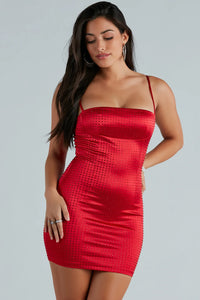 Ready to make a statement? Yes, please in this stunning satin mini dress! The short dress features a square neckline, adjustable spaghetti straps, an underbust seam, a flattering bodycon silhouette, and a mini-length hem. The satin fabric has all-over colored rhinestone embellishments. Complete the look in platform heels for a night out!