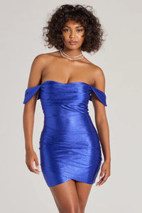 Glam Attire Glitter Satin Off-The-Shoulder Mini Dress